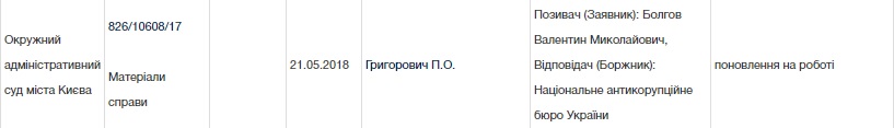 Окружний адміністративний суд Києва поновив на роботі старшого детектива Національного антикорупційного бюро Валентина Болгова, звільненого за порушення присяги, правил етичної поведінки держслужбовця, за дії, що шкодять авторитету державної служби і використання повноважень в особистих інтересах.