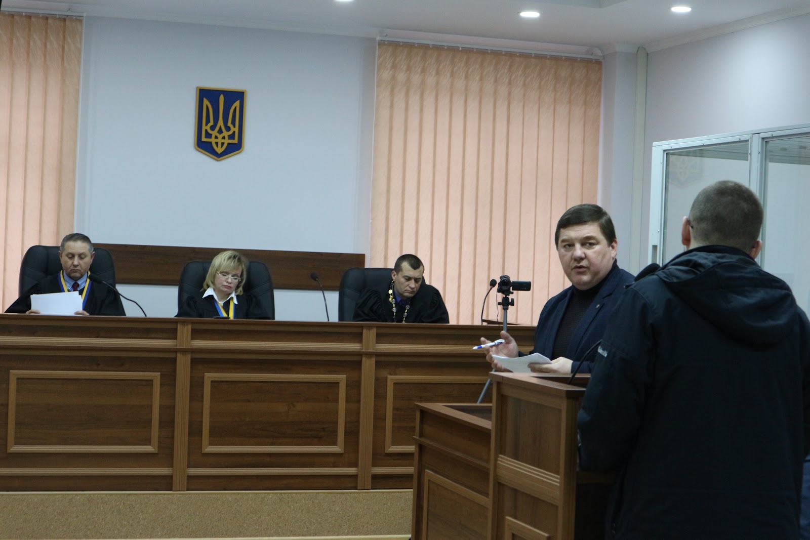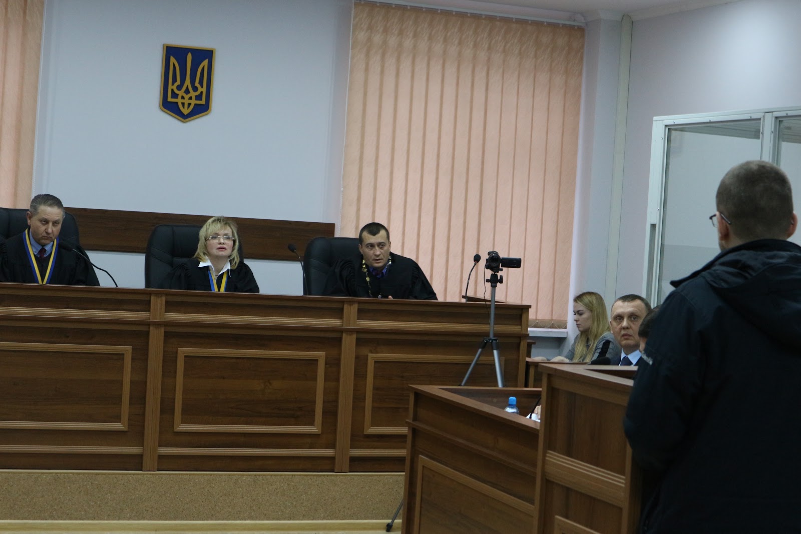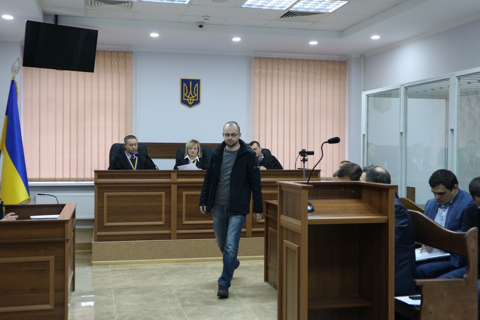 Дмитро Сус зайшов до залу. Суддя запитала, чи знайомий він із обвинуваченими і заявником. Він заперечив. Суд привів його до присяги.