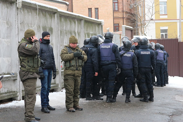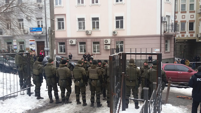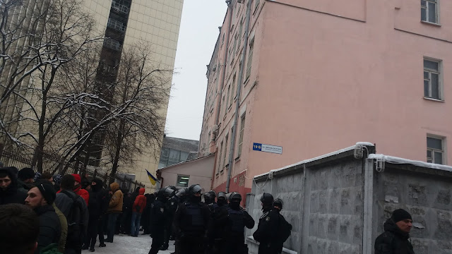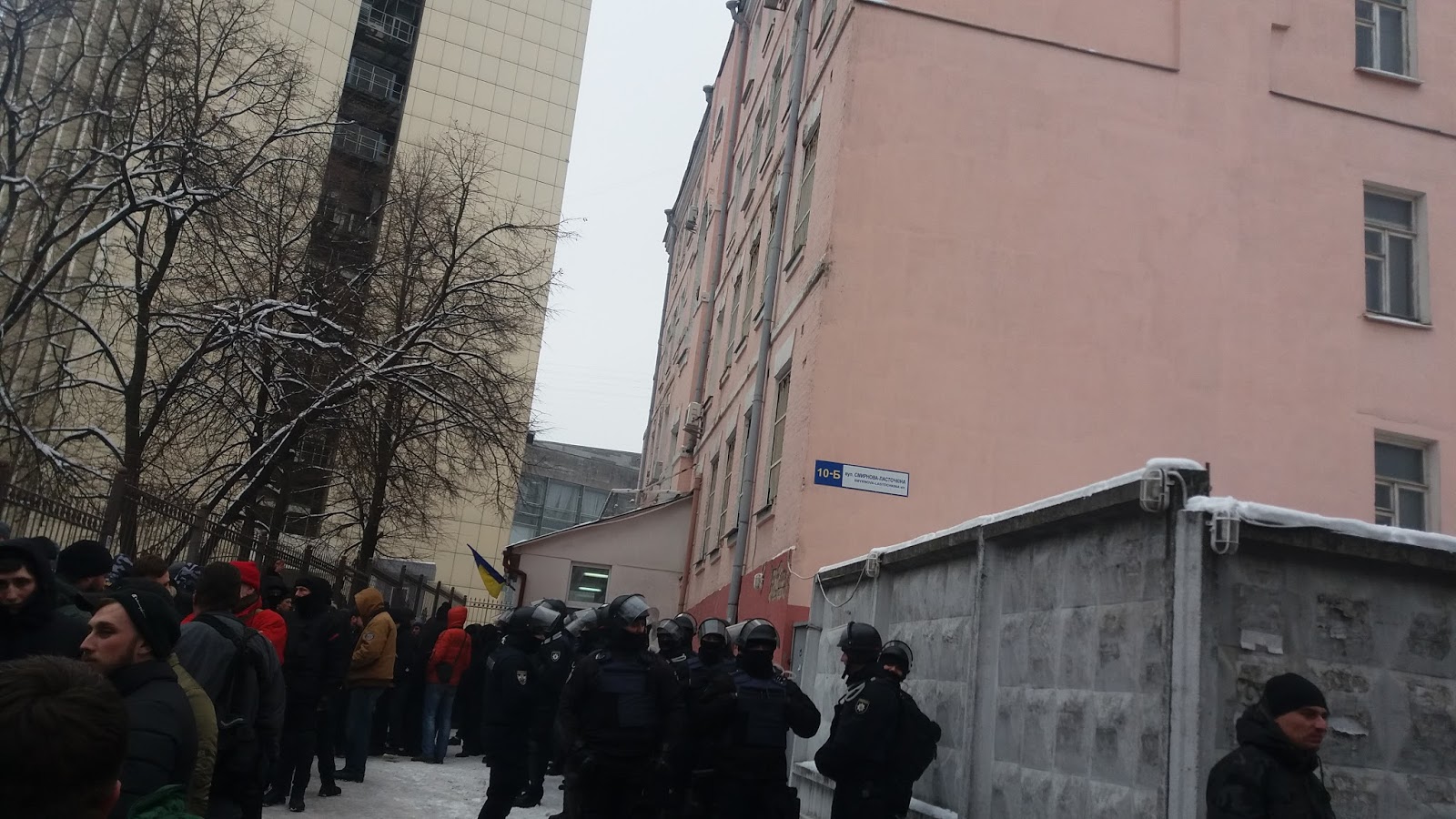Пізніше до суду підтягнулися загони “Національної дружини”, а також поліції. Станом на 14.00 на подвір’ї багато людей у формі.