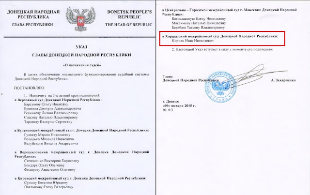 Також 4 серпня суддя Киріяк виніс постанову про визнання та виконання на території «ДНР» вироку іменем України Торезького міського суду Донецької області від 11 червня 2013 року по кримінальній справі в частині стягнення матеріальної та моральної шкоди.