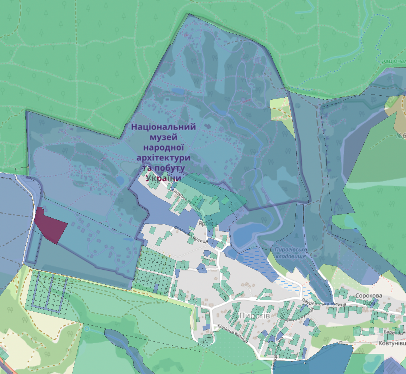 Ця ділянка накладається на територію 97,7 га, що з 70 років ХХ століття перебуває у постійному користуванні Національного музею народної архітектури та побуту України.