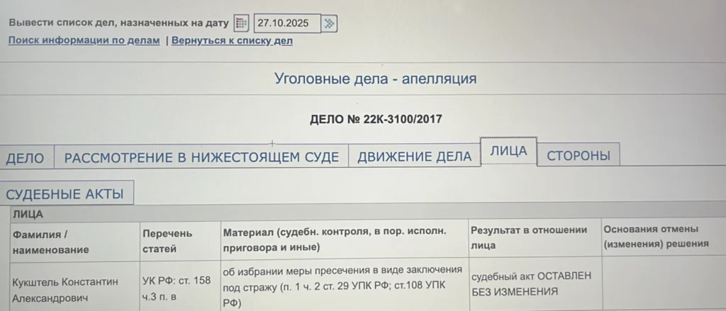 На сайті окупаційного Верховного суду Криму є інформація, що восени 2017-го, тобто саме перед виїздом із півострова, Кукштель утримувався під вартою за підозрою в крадіжці.